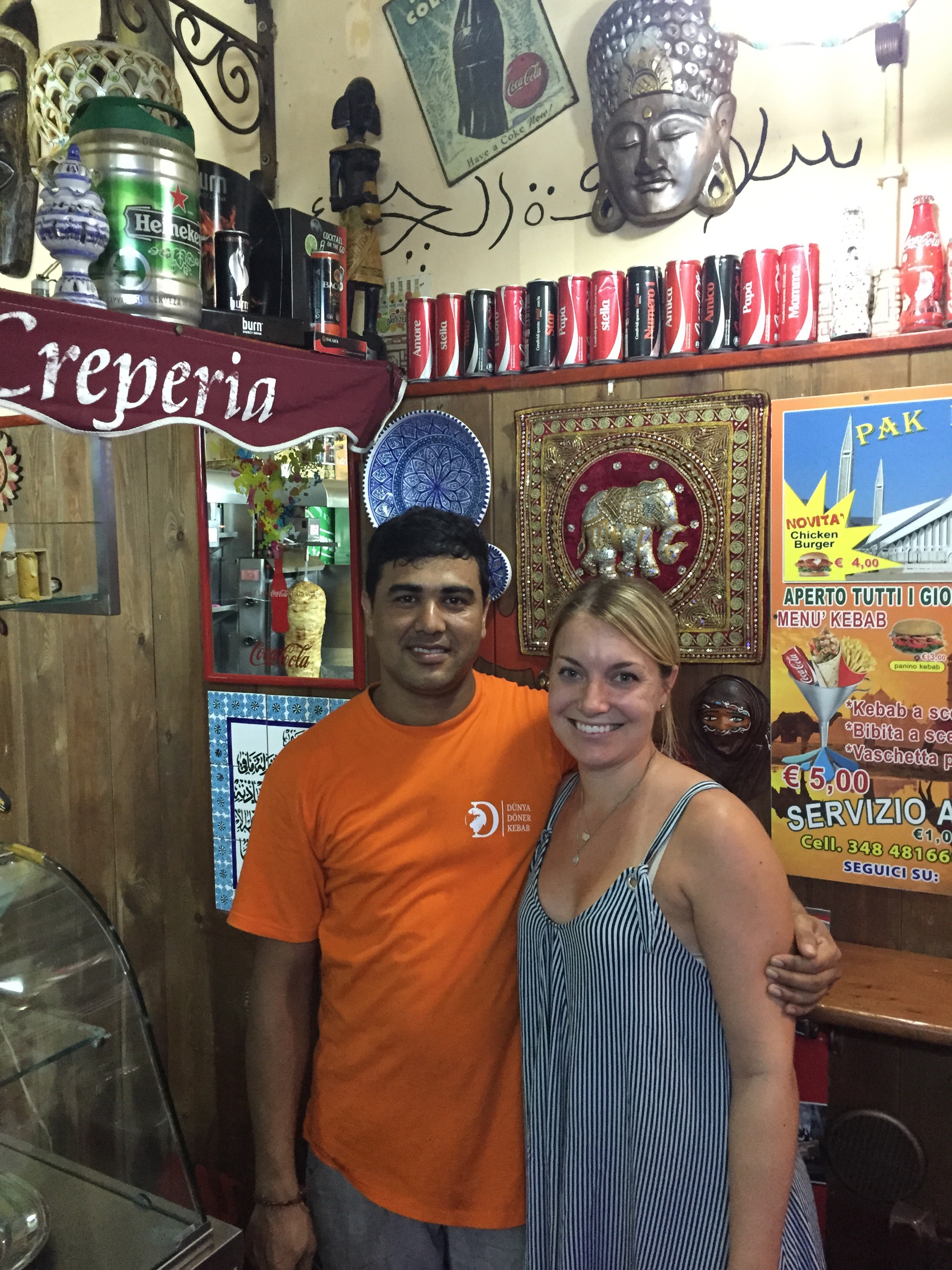 Gia owns a Mediterranean restaurant in Catania, Sicily that’s simply called “Kebab”. When we finally found a room late during our first night in Sicily, we arrived hungry and luckily stumbled into his humble restaurant. It was the only place close to our hotel that was open at 1AM. Gia came to Catania from Bangladesh, and has lived in the area for the past 5 years. While he loves running his restaurant, he is admittedly unimpressed with Sicily in general, and often misses his home in Bangladesh. Gia served us with the best Kebab wraps that we have ever had, anywhere. To be honest, there’s no way to describe them. Meat, peppers, hot sauce, cabbage, tzatziki sauce, tomatoes, and then the secret ingredient: french fries! These wraps are huge! Needless to say, Gia treated us like locals and we didn’t go to bed hungry. We will definitely be eating at his place again before we leave!